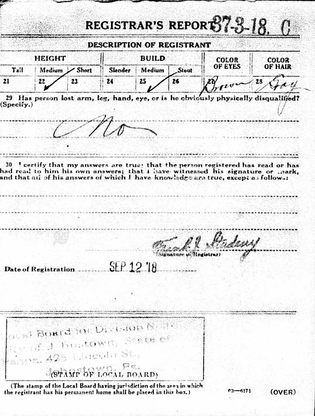 Bernetta Seitz were married. He died on September 19, 1954, at age 67, in Johnstown, Cambria, Pennsylvania, USA. He was buried in Saint Joseph Cemetery, Geistown, Pennsylvania.