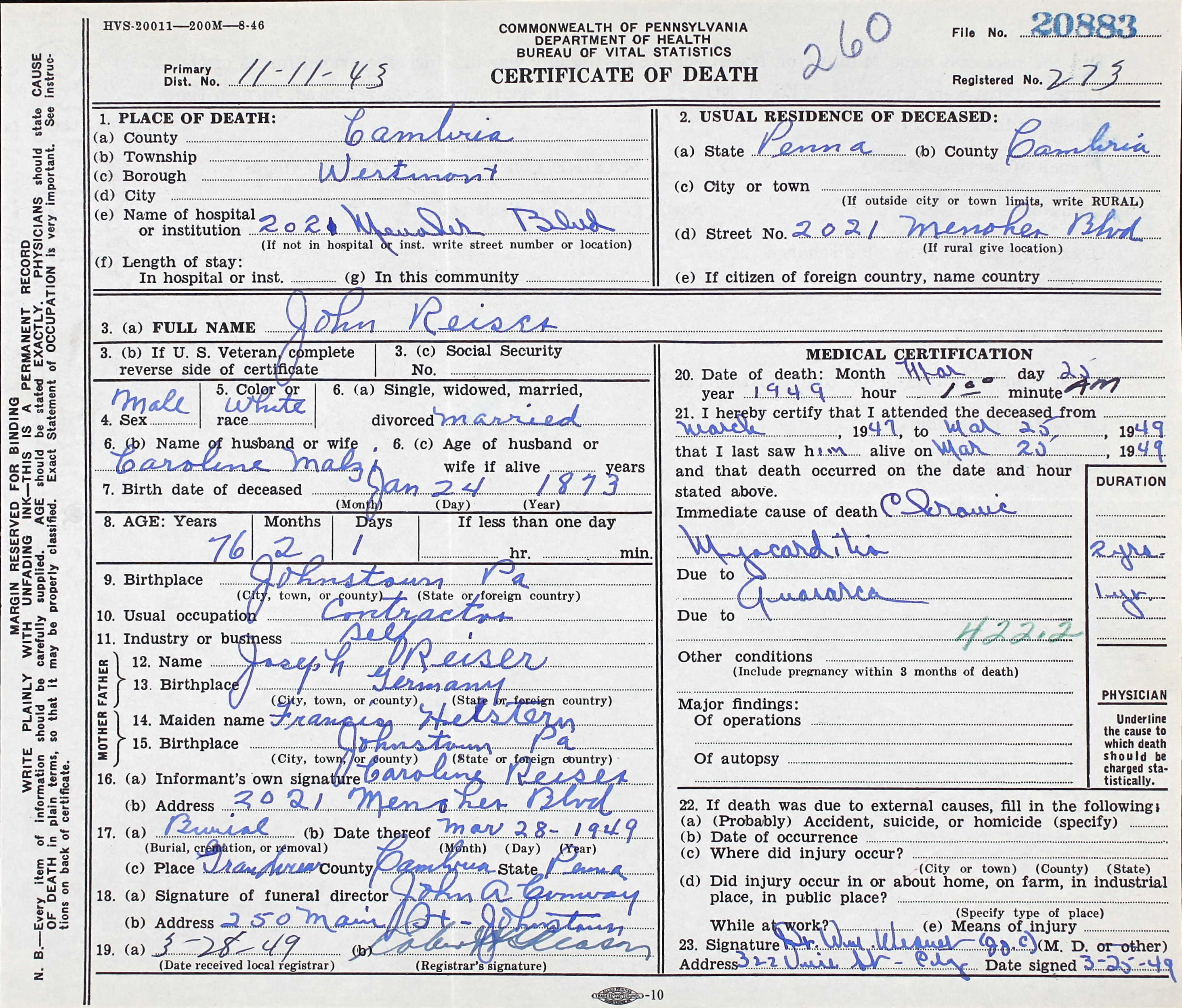 Caroline Malzi were married in 1900. He died on March 25, 1949, at age 76, in Johnstown, Cambria, Pennsylvania, USA. He was buried in Grandview Cemetery, Johnstown, Pennsylvania.