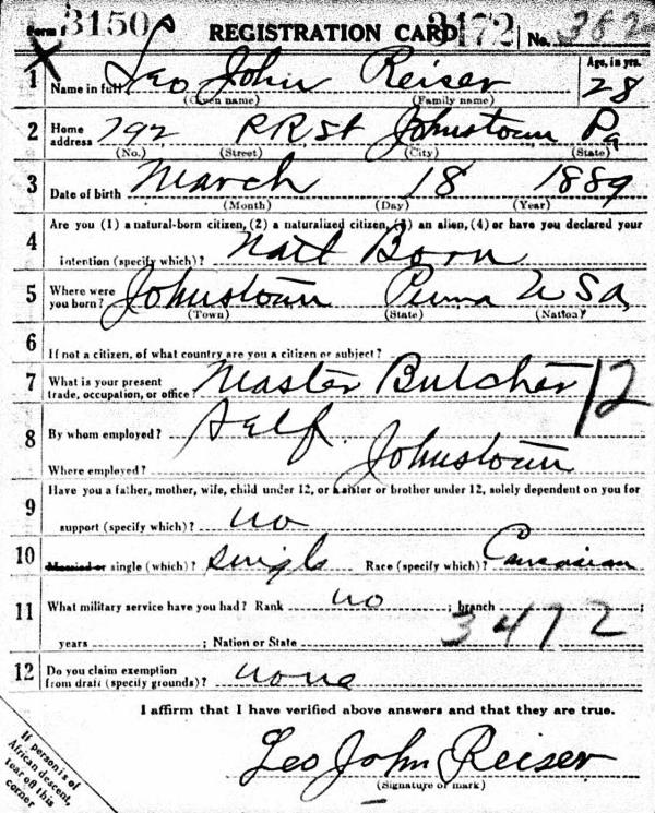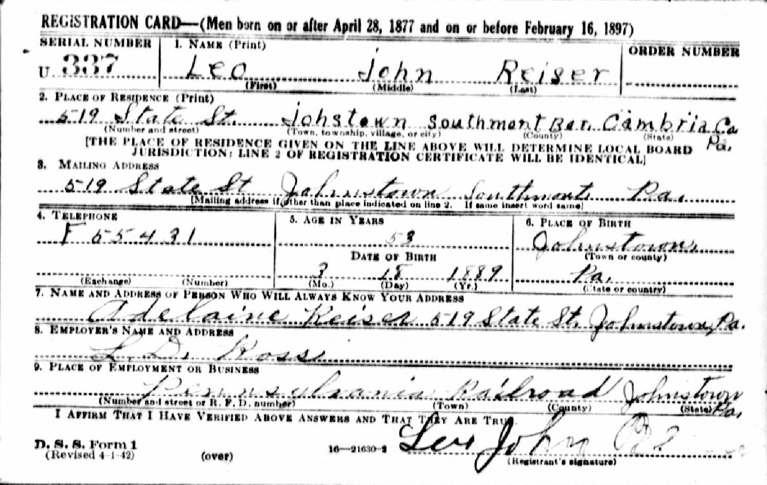 Leo John Reiser was born on March 18, 1889 in Johnstown, Cambria, Pennsylvania, USA. He and