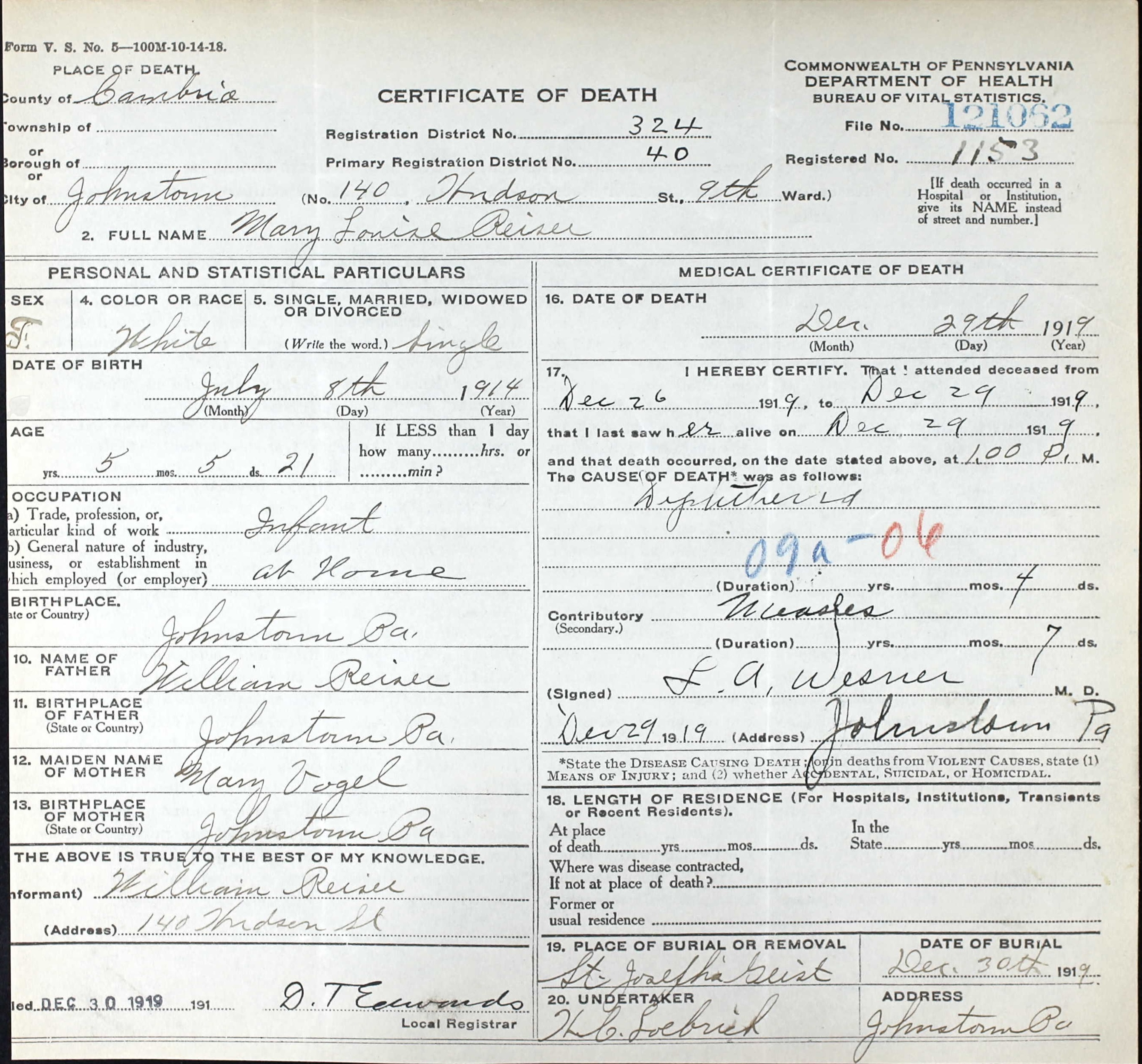 Mary Louise Reiser was born on July 8, 1914 in Johnstown, Cambria, Pennsylvania, USA. She died on December 29, 1919, at age 5, in Johnstown, Cambria, Pennsylvania, USA. She was buried in Saint Joseph Cemetery, Geistown, Pennsylvania.