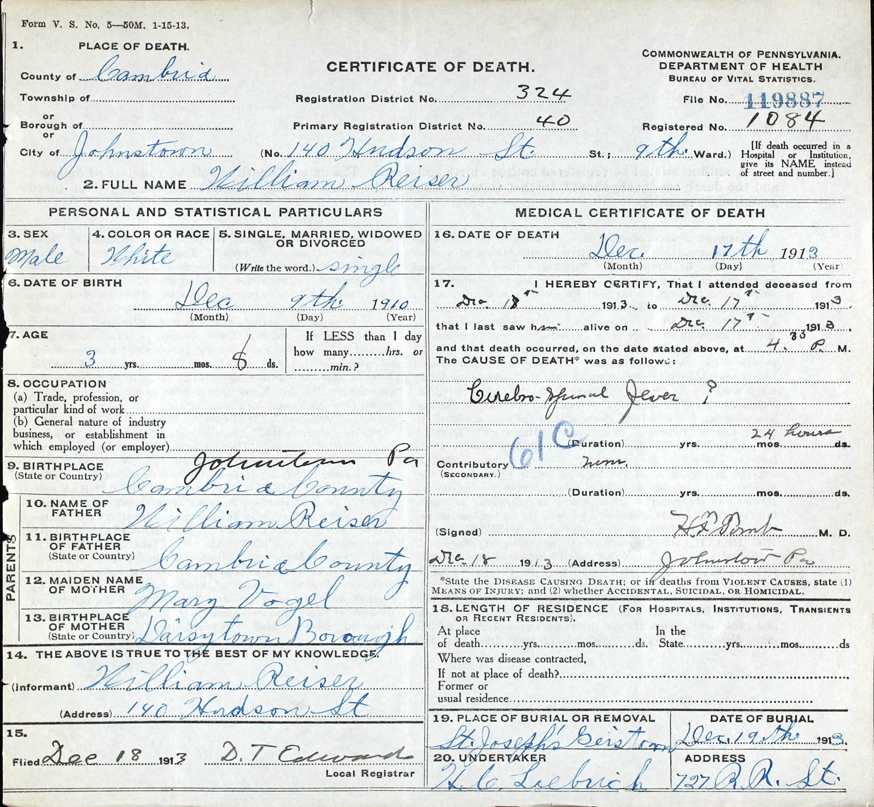 William Reiser, Jr., was born on December 9, 1910 in Johnstown, Cambria, Pennsylvania, USA. He died on December 17, 1913, at age 3, in Johnstown, Cambria, Pennsylvania, USA. He was buried in Saint Joseph Cemetery, Geistown, Pennsylvania.
