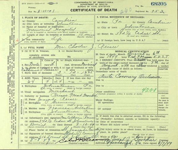 Catherine M. Vogel were married. He died on August 6, 1949, at age 64, in Johnstown, Cambria, Pennsylvania, USA.