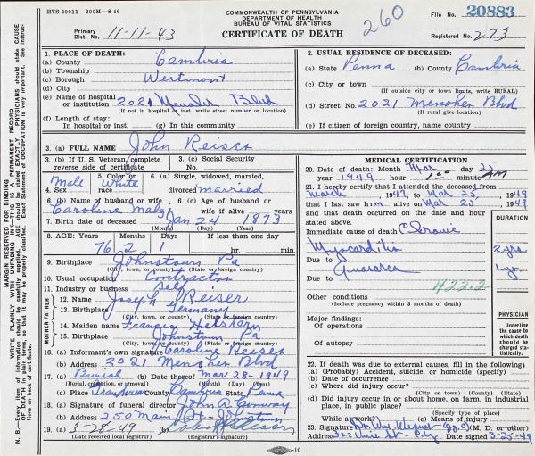 Family: John Reiser Born: January 24, 1873, Died: March 25, 1949