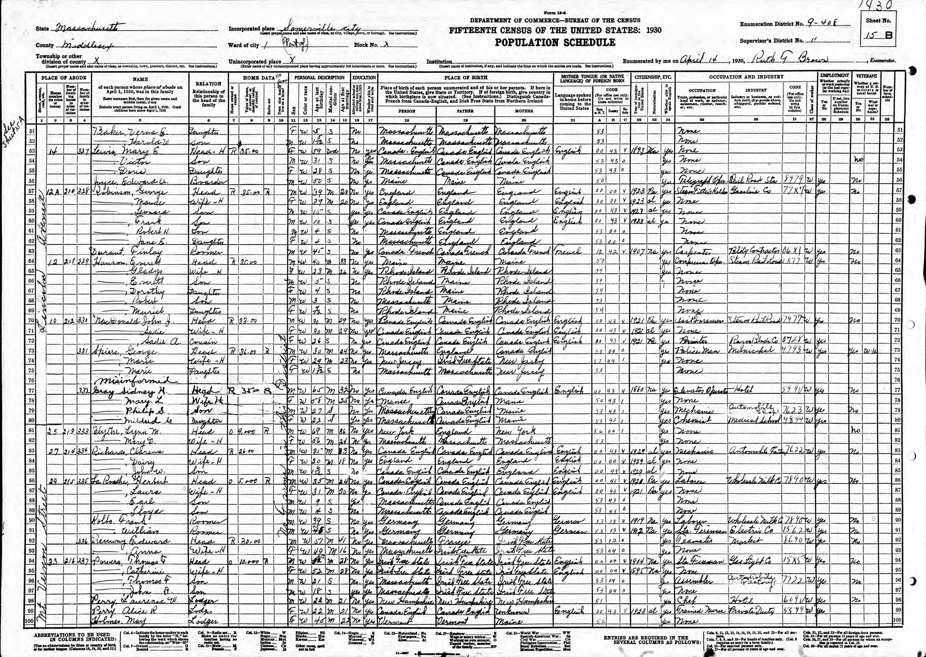 Hanson Family 1930 Federal Census Massachusetts, Lines 64-69