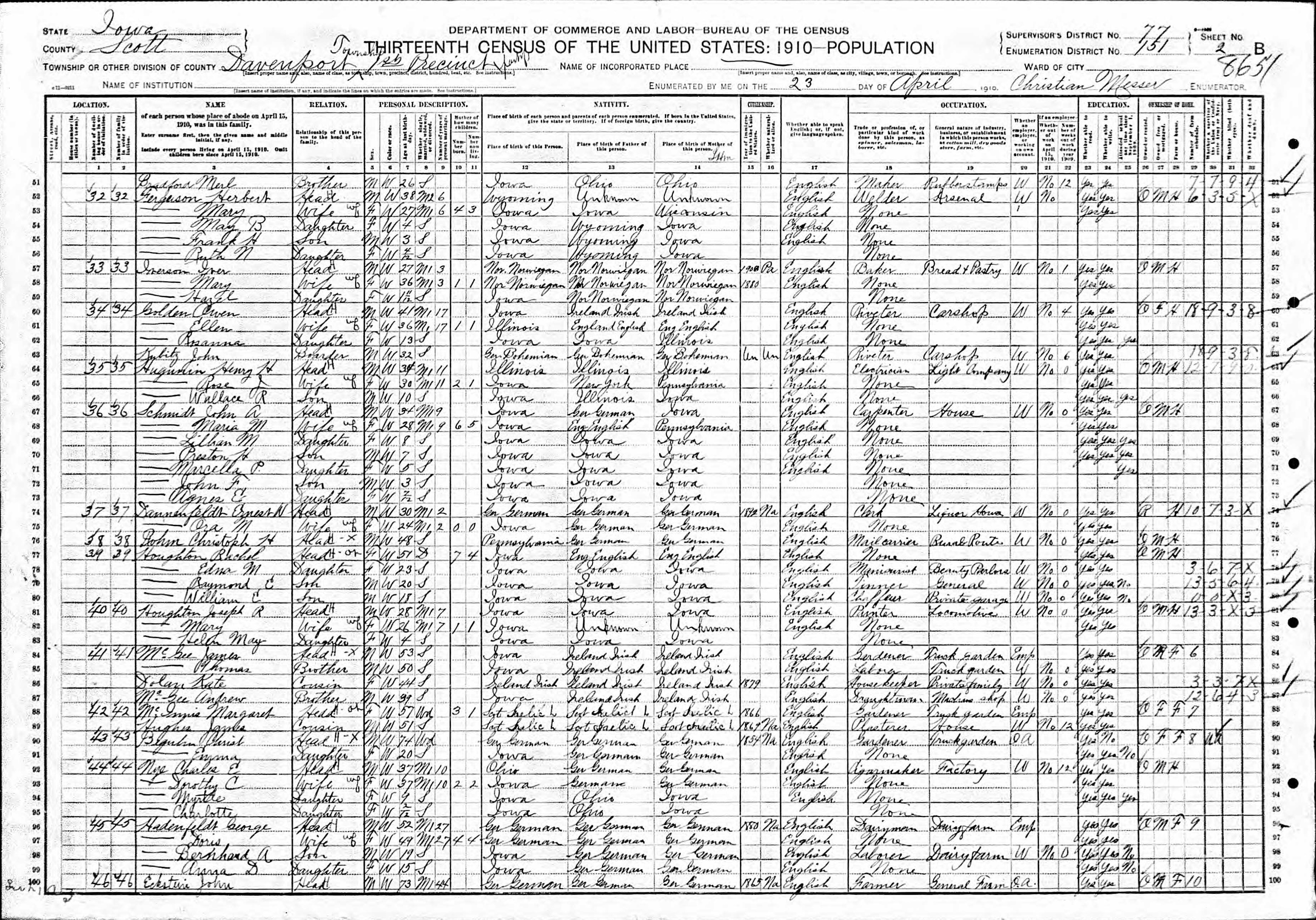 Dannenfeldt Family 1910 Federal Census Iowa, Lines 74-75