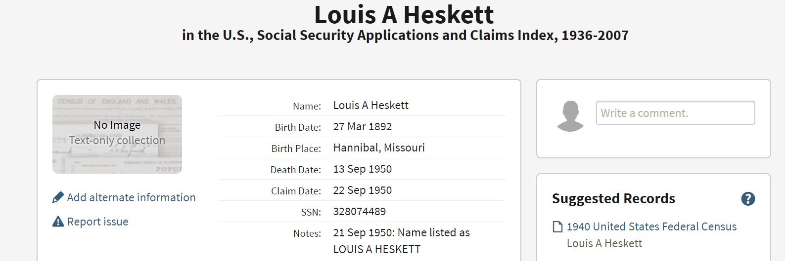 Louis Allen Heskett was born on March 27, 1892 in Hannibal, Marion, Missouri, USA. He and