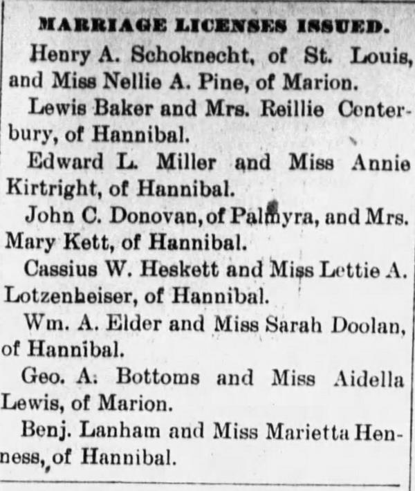 Serrelda Hammon were married. He died on June 18, 1919, at age 65, in Hannibal, Marion, Missouri, USA. He was buried in Mount Olivet Cemetery, Hannibal, Missouri.