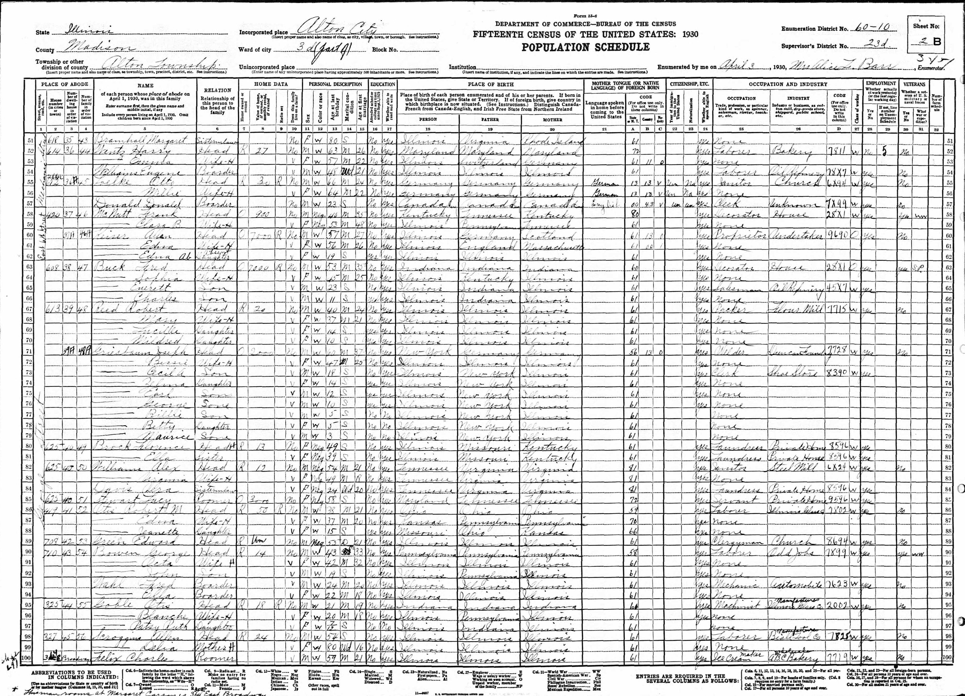Margaret Bramhall 1930 Federal Census Illinois, Line 51