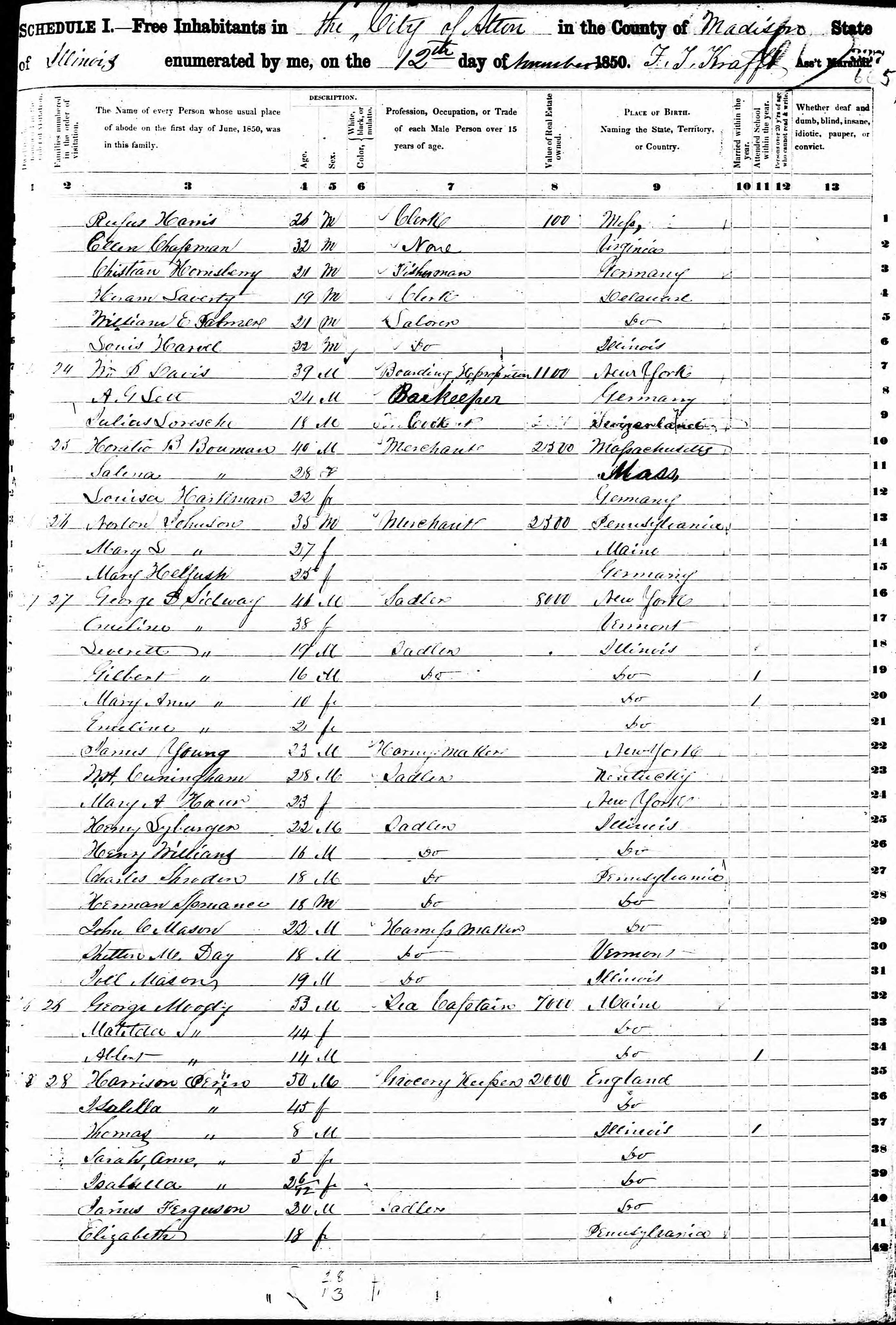 Louis Harville 1850 Federal Census Illinois, Line 6