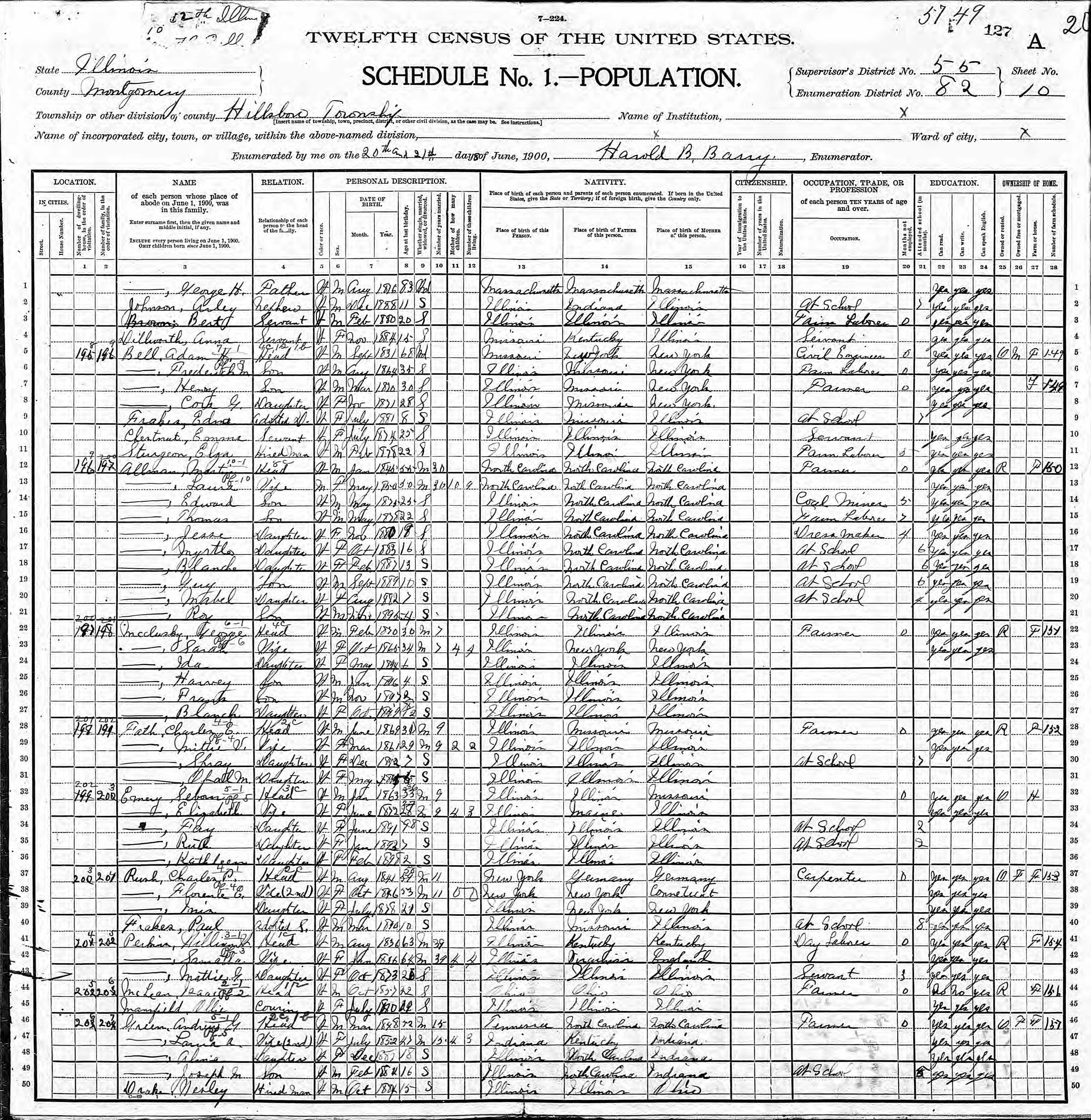 Harville Family 1900 Federal Census Illinois, Lines 51-52