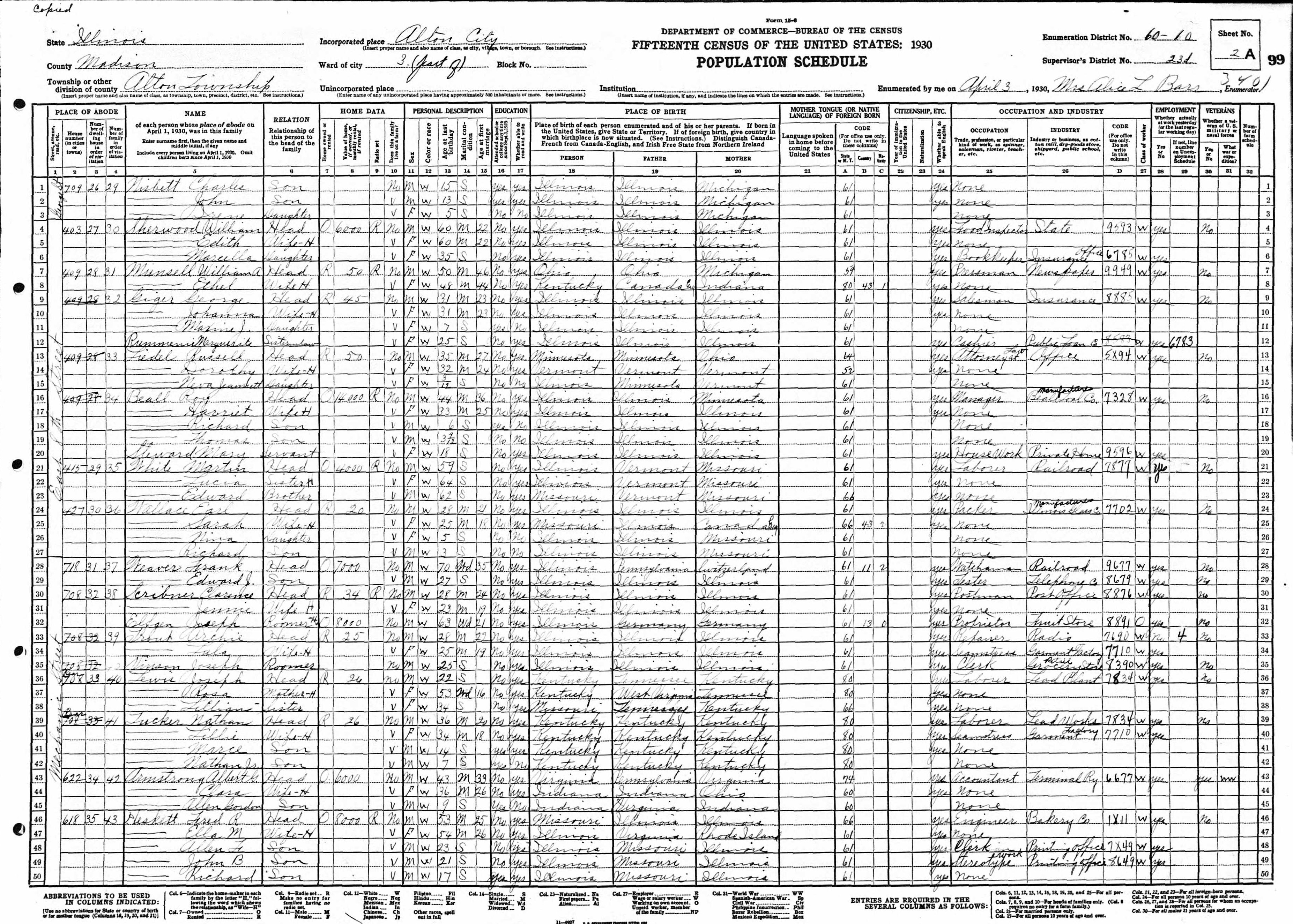 Heskett Family 1930 Federal Census Illinois, Lines 46-50