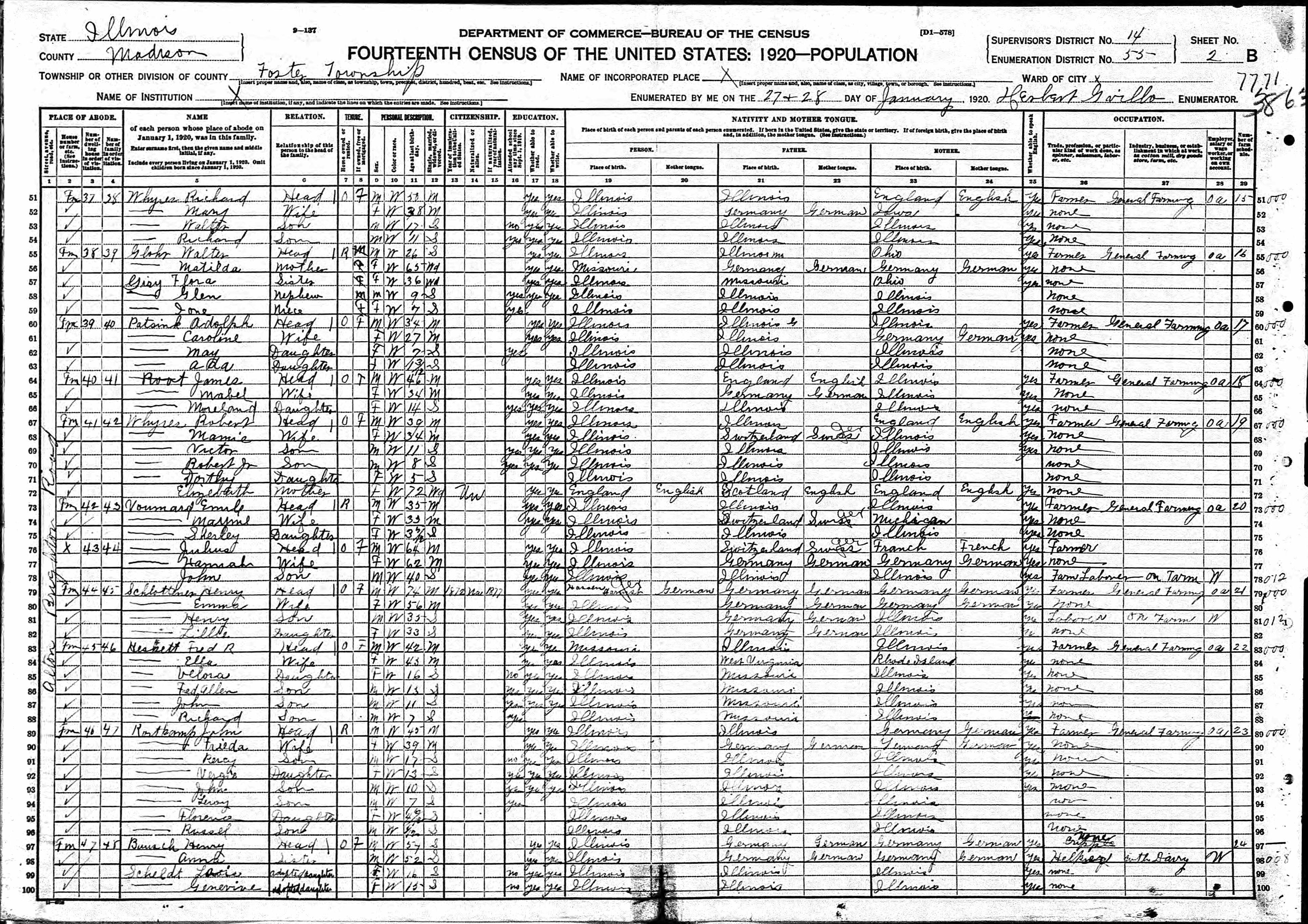 Heskett Family 1920 Federal Census Illinois, Lines 83-88