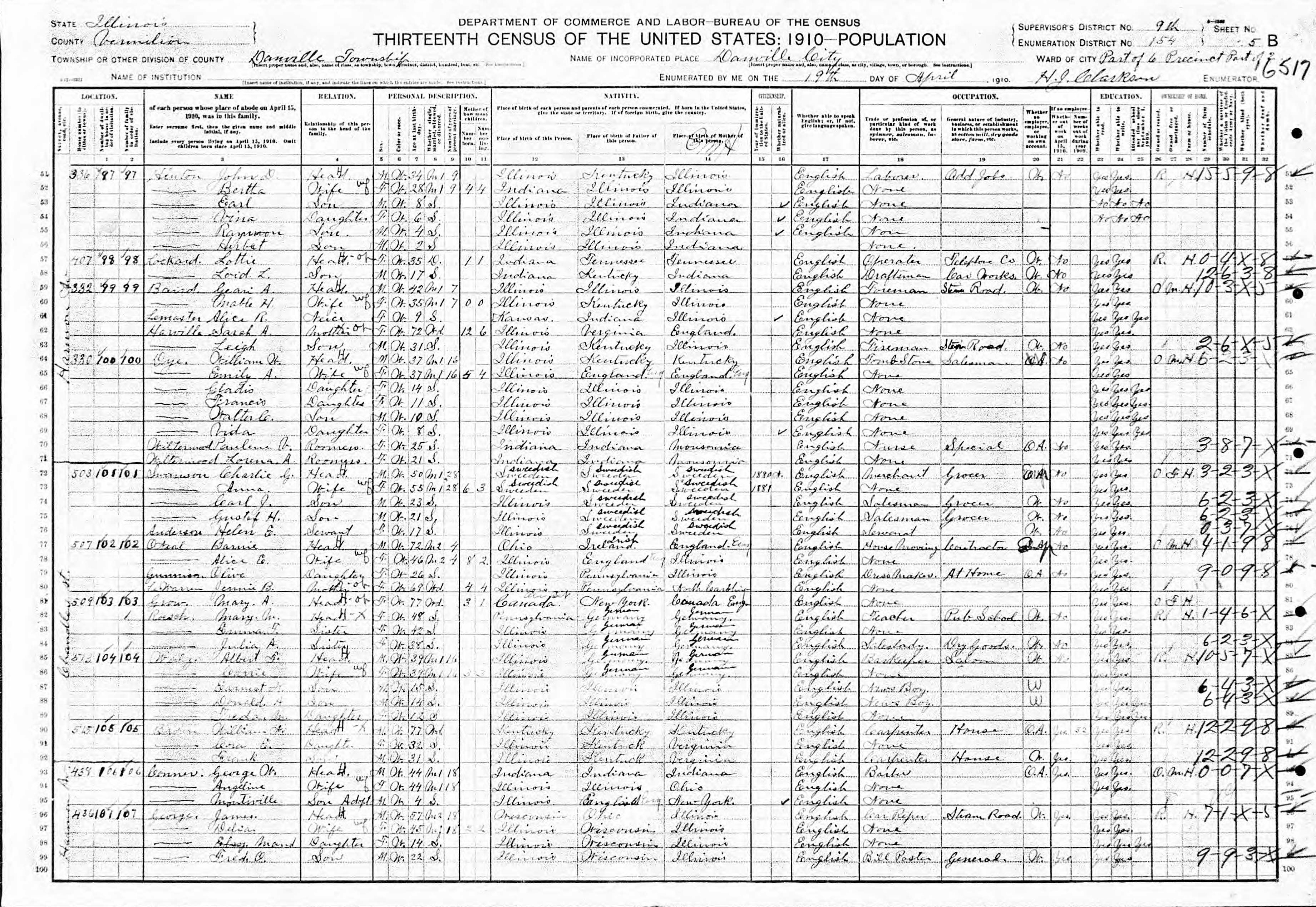 Heskett Family 1910 Federal Census Illinois, Lines 80-84