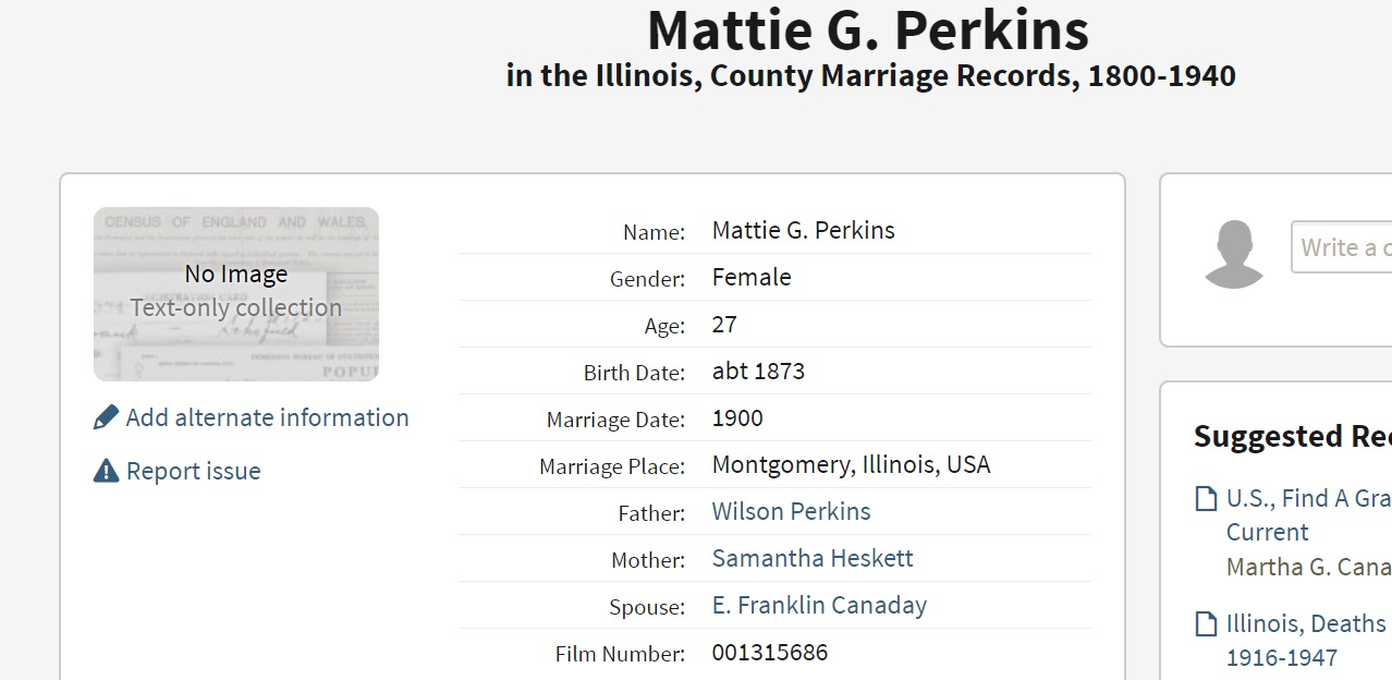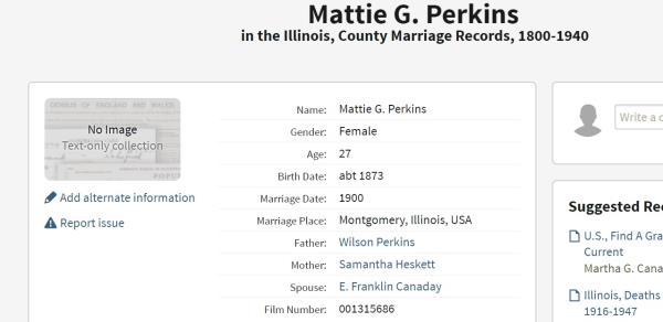 Martha "Mattie" G. Perkins was born on October 30, 1873 in Illinois, USA. She and