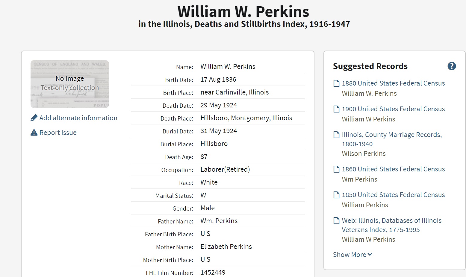 William C. Perkins was born on August 26, 1861 in Alton, Madison, Illinois, USA. He died on October 3, 1928, at age 67, in Hillsboro, Montgomery, Illinois, USA.