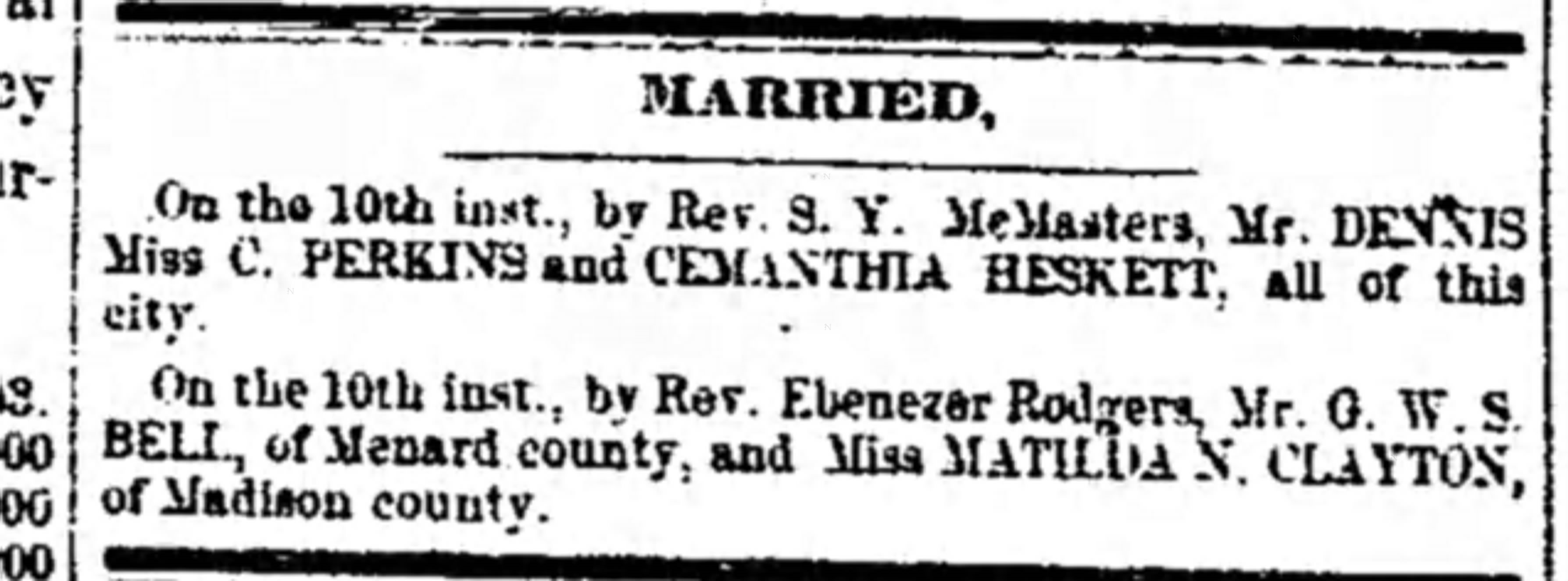 Dennis C. Perkins were married on March 10, 1853 in Madison, Illinois, USA. She and