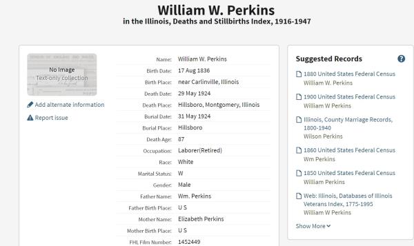 William Wilson Perkins was born on August 17, 1836 in Macoupin, Illinois, USA. He and