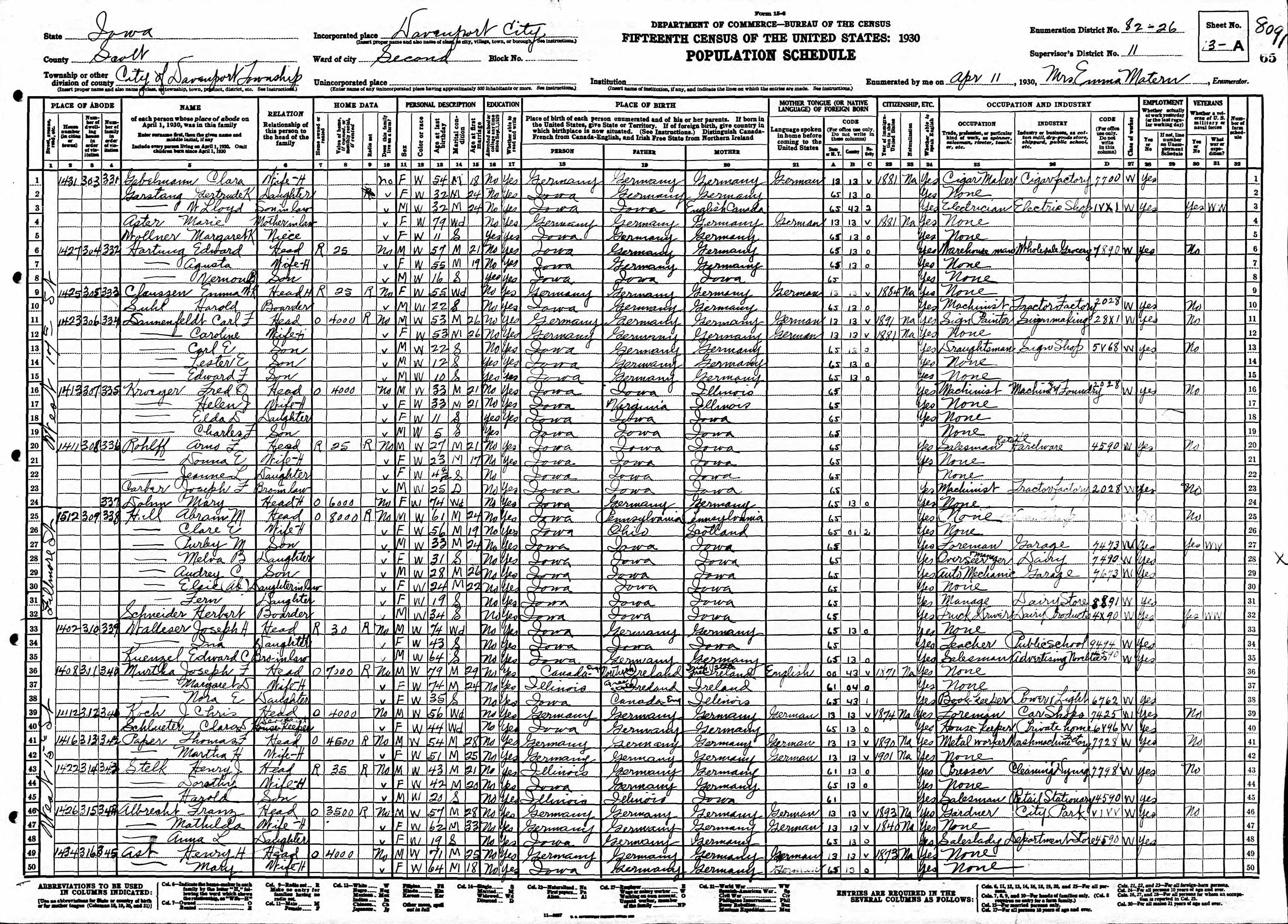 Dannenfeldt Family 1930 Federal Census Iowa, Lines 11-15