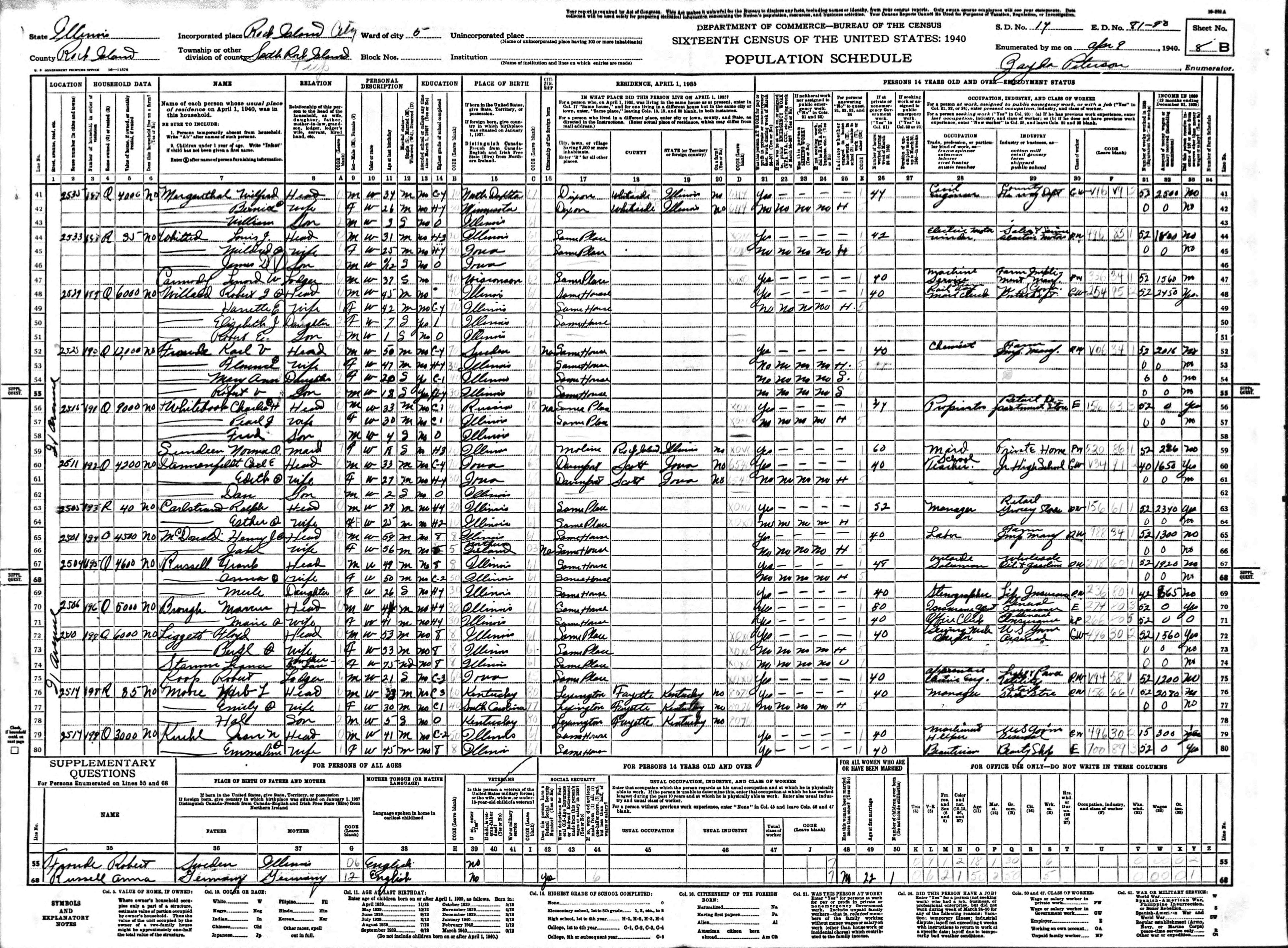 Dannenfeldt Family 1940 Federal Census Illinois, Lines 60-62
