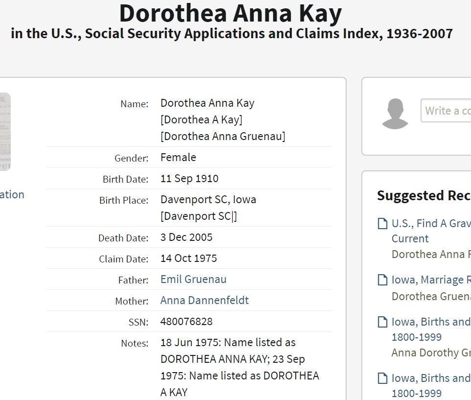Dorothea Anna Gruenau was born on September 11, 1910 in Davenport, Scott, Iowa, USA. She and