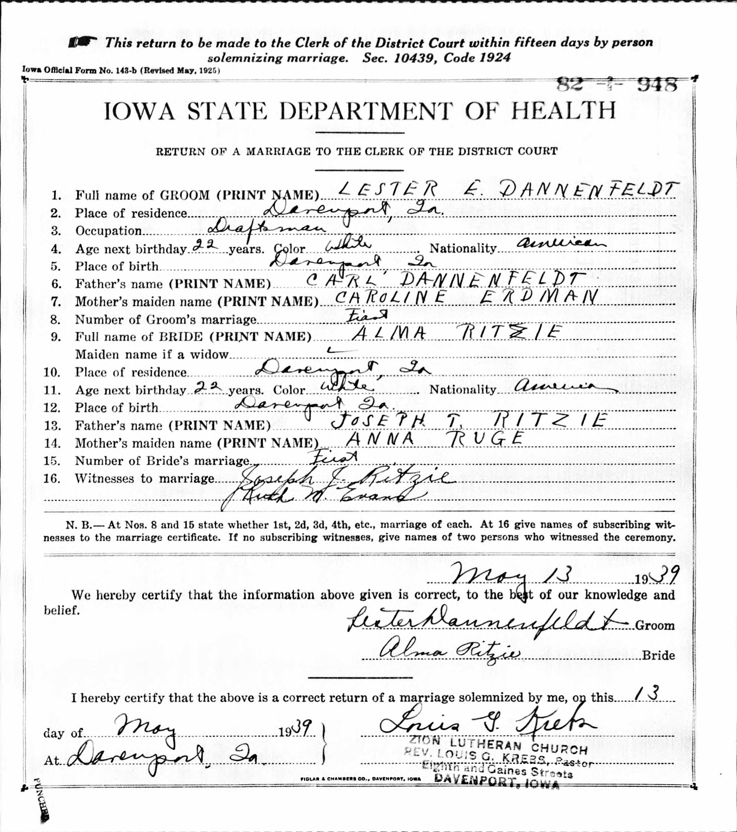 Lester Erdman Dannenfeldt were married on May 13, 1939 in Davenport, Scott, Iowa, USA. She died.
