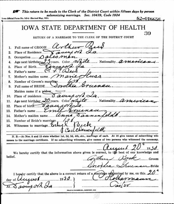 Arthur Beck were married on August 20, 1930 in Davenport, Scott, Iowa, USA. She and