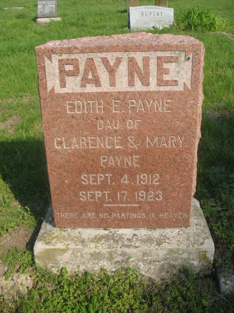 Edith Ellen Payne was born on September 4, 1912. She died on September 17, 1923, at age 11. She was buried in Samuel Taylor Cemetery, Rockport, Illinois.
