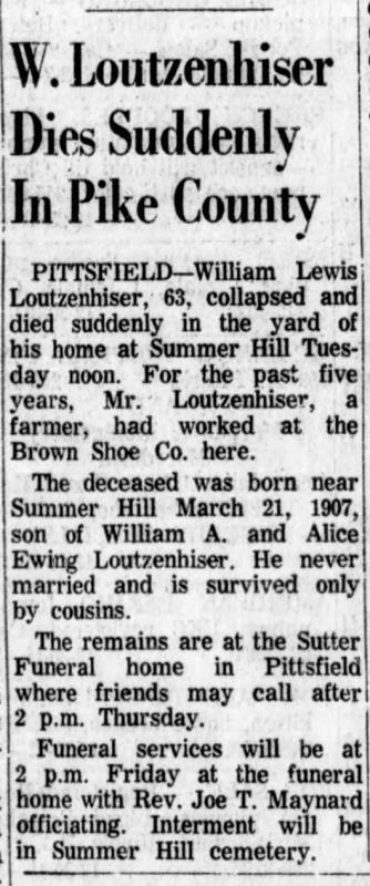 Lewis William Loutzenhiser was born on March 21, 1907 in Summer Hill Cemetery, Summer Hill, Illinois. He died in 1970, at age ~63, in Illinois, USA. He was buried in Summer Hill Cemetery, Summer Hill, Illinois.