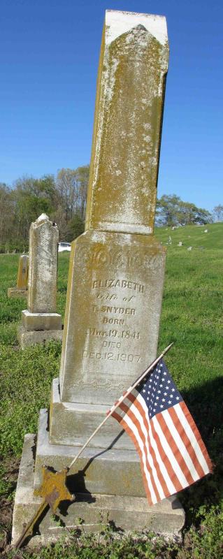 Theophilus Snyder were married. She died on December 12, 1907, at age 66. She was buried in Samuel Taylor Cemetery, Rockport, Illinois.