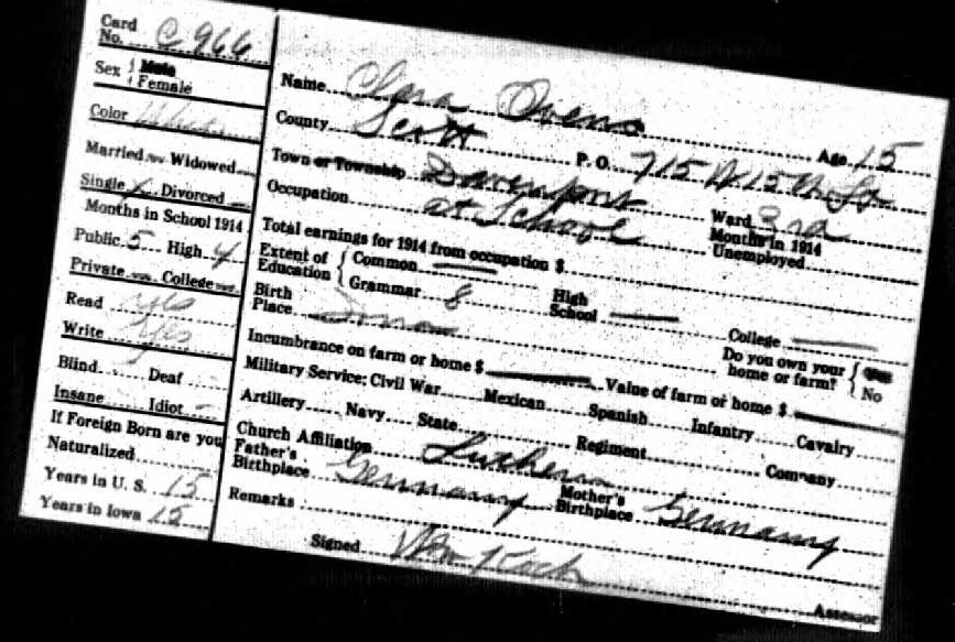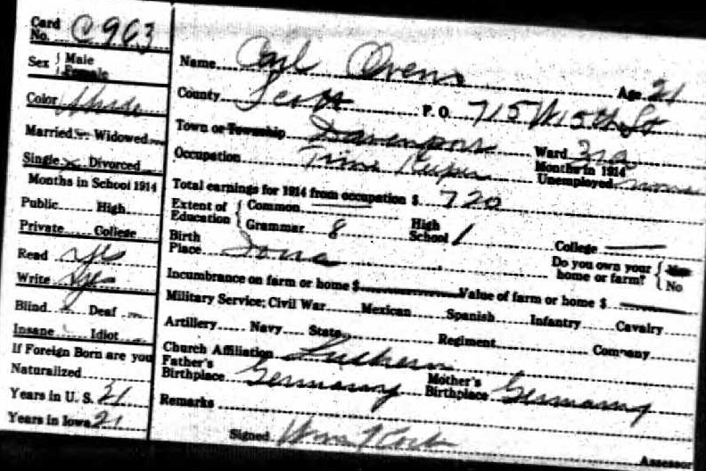 Clara Ovens 1915 State Census Iowa