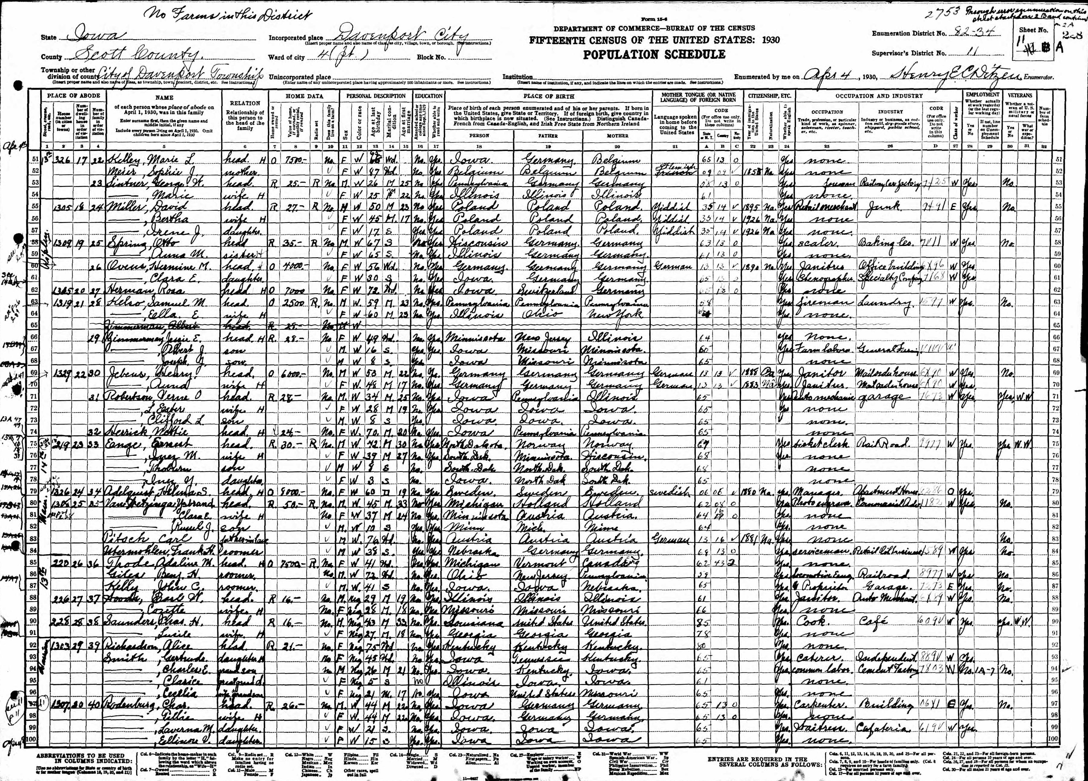 Heskett Family 1930 Federal Census Iowa, Lines 66-70