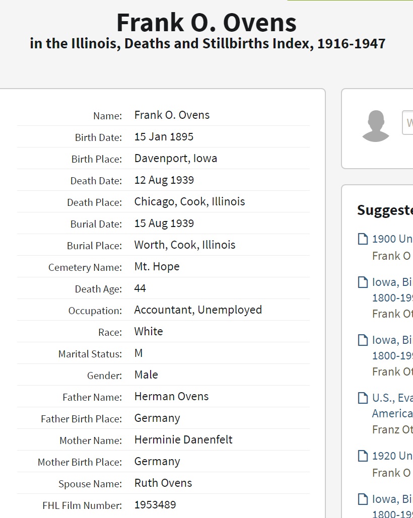Frank Otto Ovens was born on January 15, 1895 in Davenport, Scott, Iowa, USA. He and