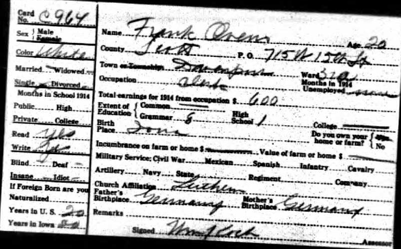 Frank Ovens 1915 State Census Iowa