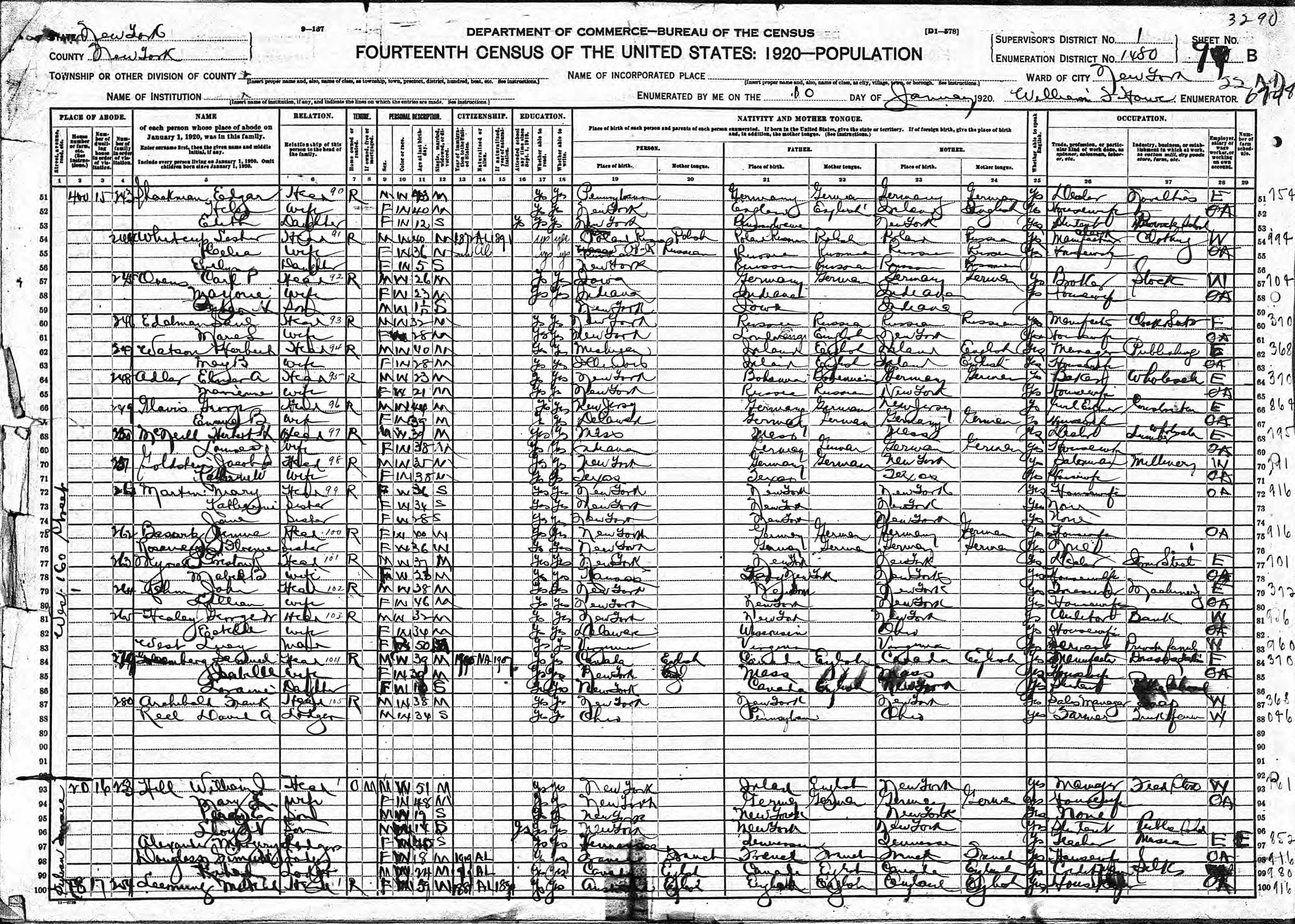 Ovens Family 1920 Federal Census New York, Lines 57-59