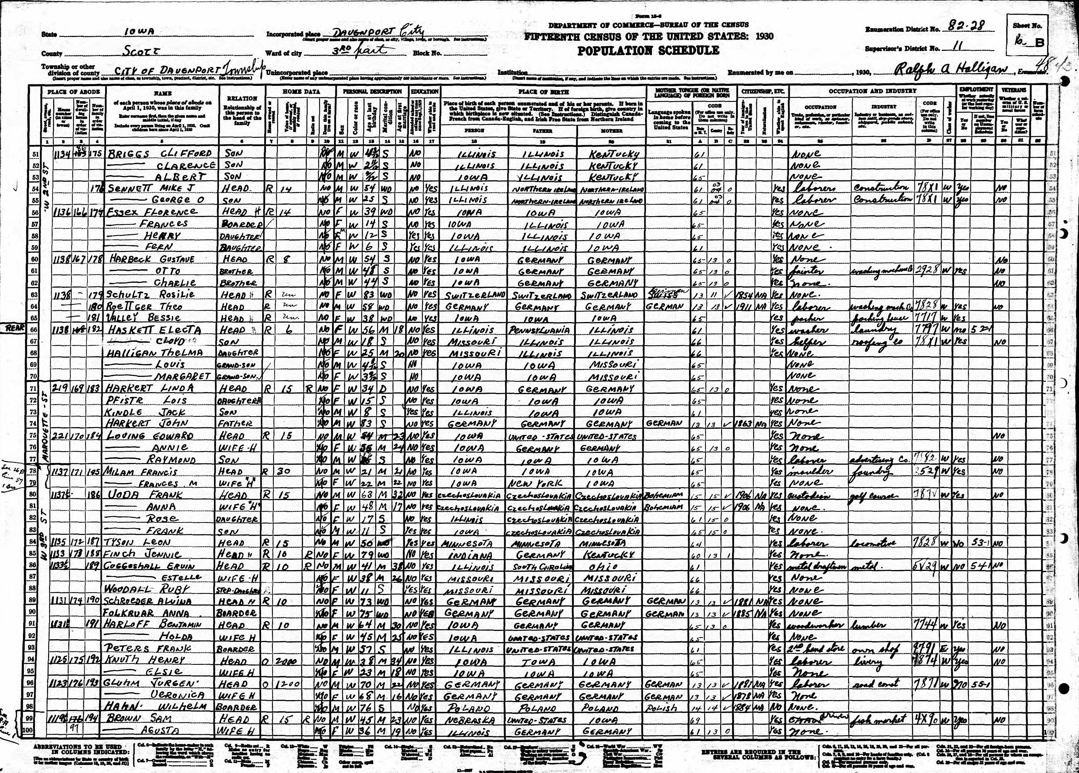 Halligan Family 1930 Federal Census Iowa, Lines 66-70