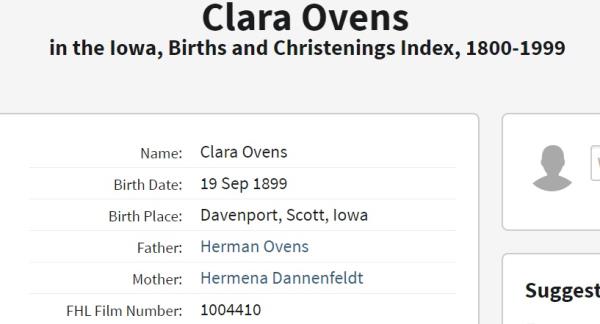 Clara Elfrieda Ovens was born on September 19, 1899 in Davenport, Scott, Iowa, USA. She died on September 3, 1959, at age 59. She was buried in Fairmount Cemetery, Davenport, Iowa.