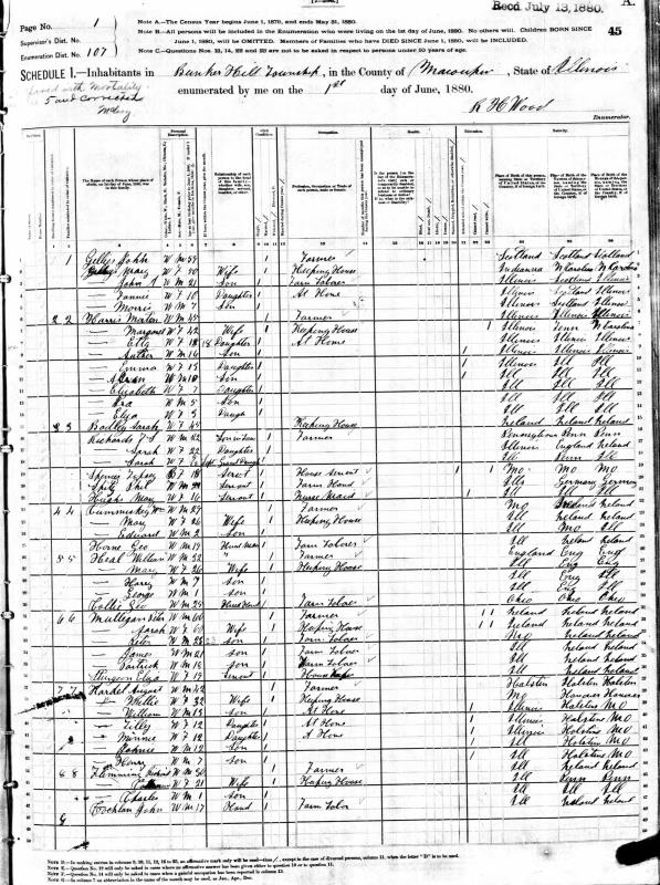 Kardell Family 1880 Federal Census Illinois, Lines 37-43