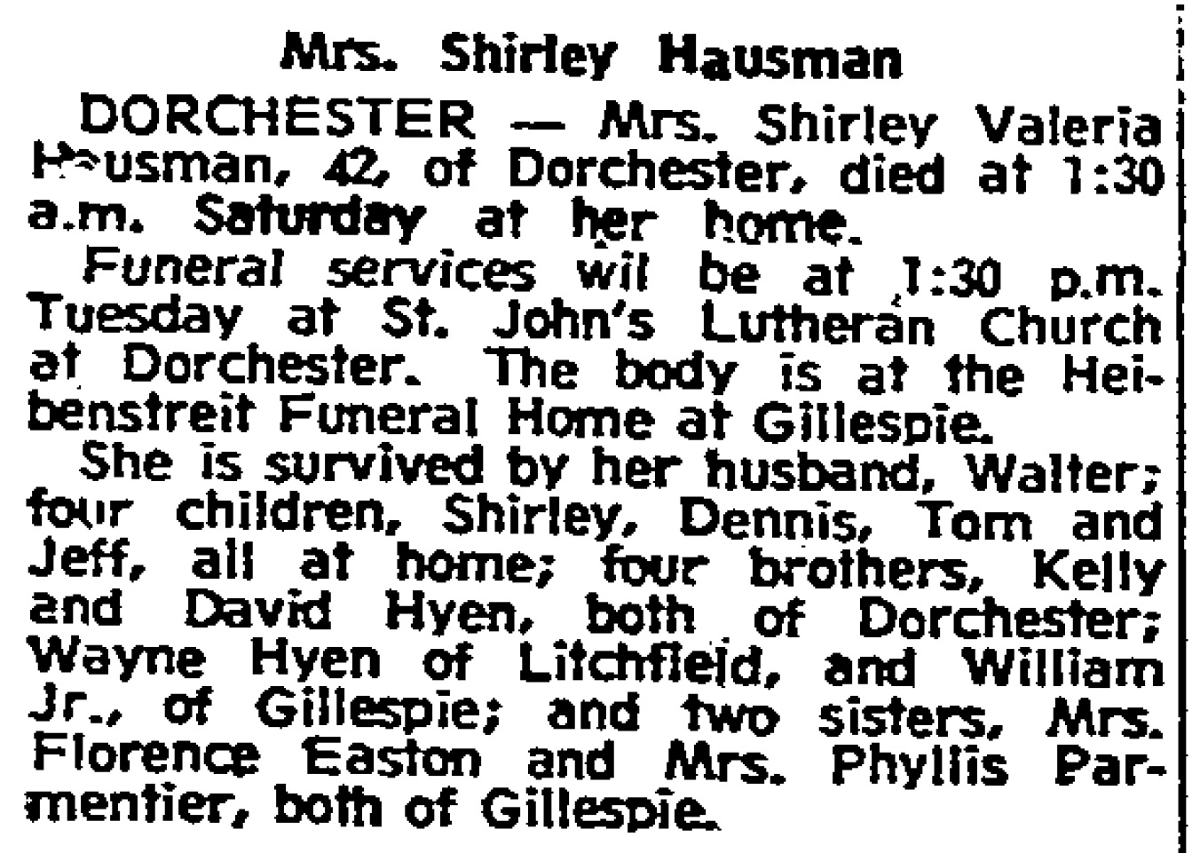 Walter Neal Hausman were married on June 1, 1947 in Dorchester, Macoupin, Illinois, USA. She died on December 23, 1967, at age ~42, in Dorchester, Macoupin, Illinois, USA.