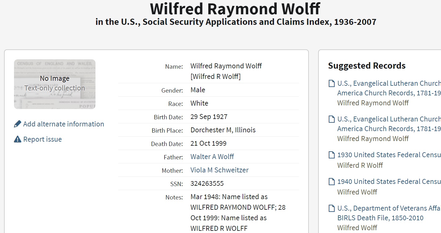 Wilfred Raymond Wolff was born on September 29, 1927 in Dorchester, Macoupin, Illinois, USA. He and