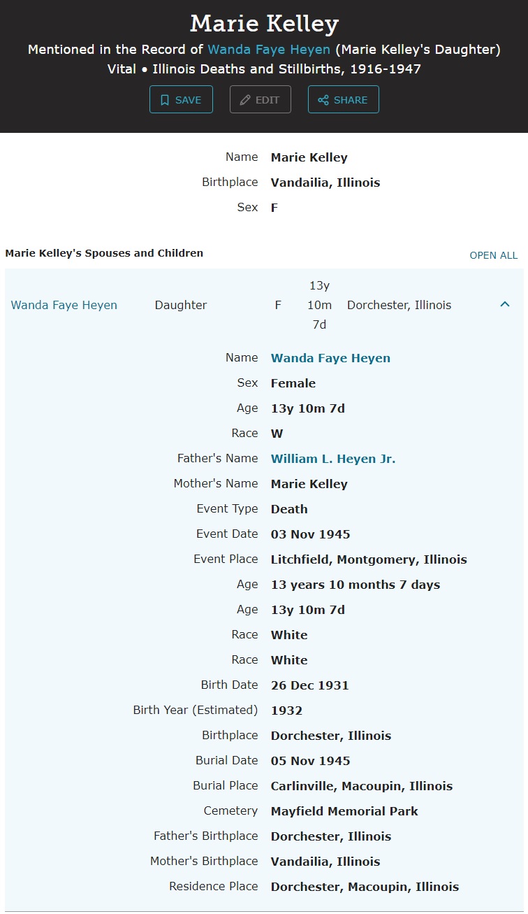 Wanda Faye Heyen was born on December 26, 1931 in Dorchester, Macoupin, Illinois, USA. She died on November 5, 1945, at age 13, in Litchfield, Montgomery, Illinois, USA. She was buried in Mayfield Memorial Park Cemetery, Carlinville, Illinois.