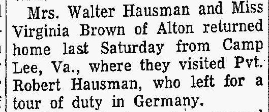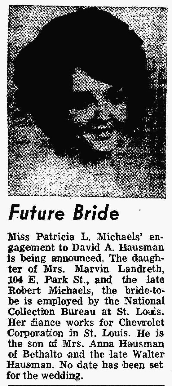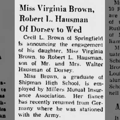 Robert Lewis "Wedge" Hausman were married on July 12, 1958. She died on May 29, 2014, at age ~79, in Bethalto, Madison, Illinois, USA. She was buried in Rose Lawn Memory Gardens, Bethalto, Illinois.