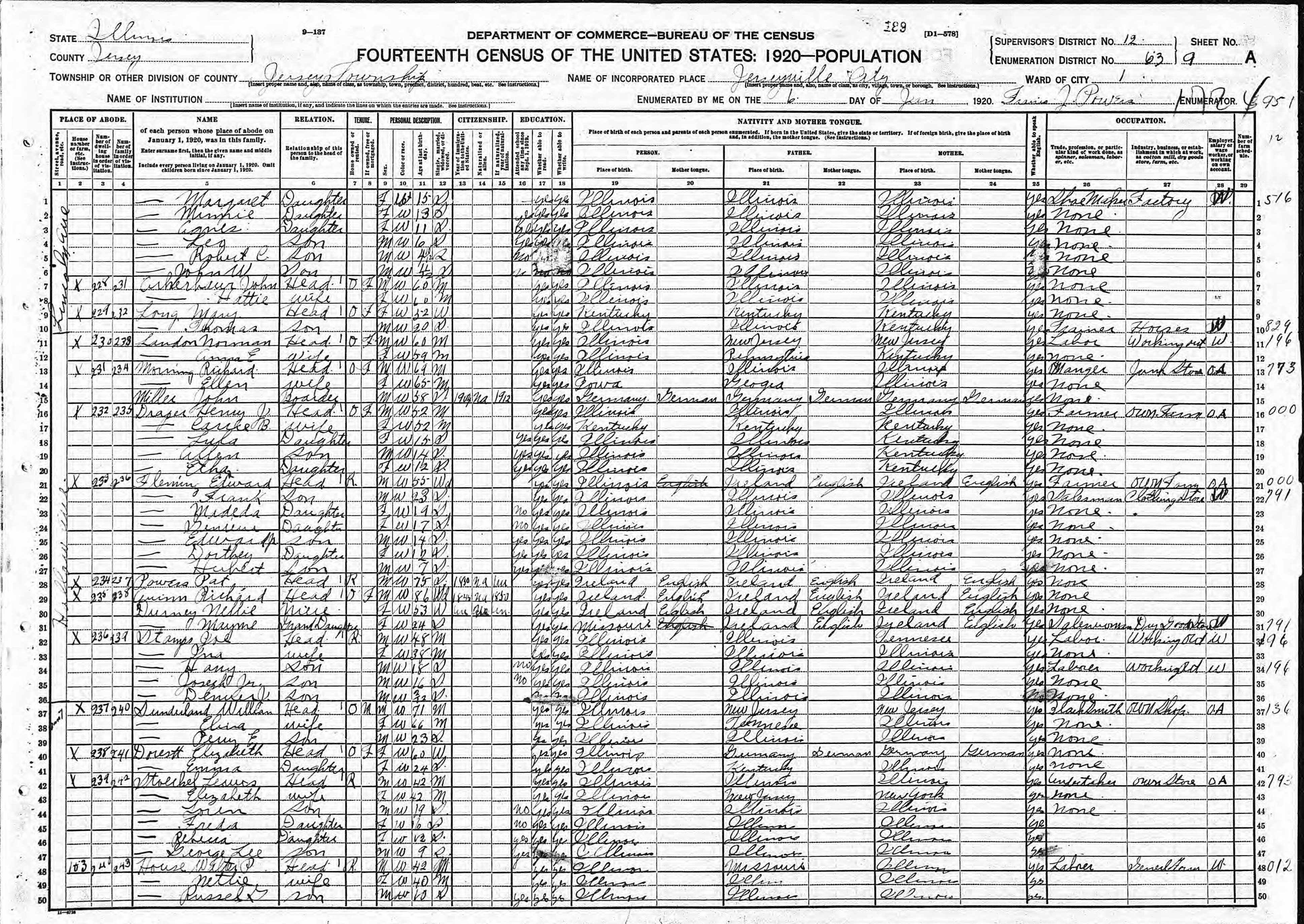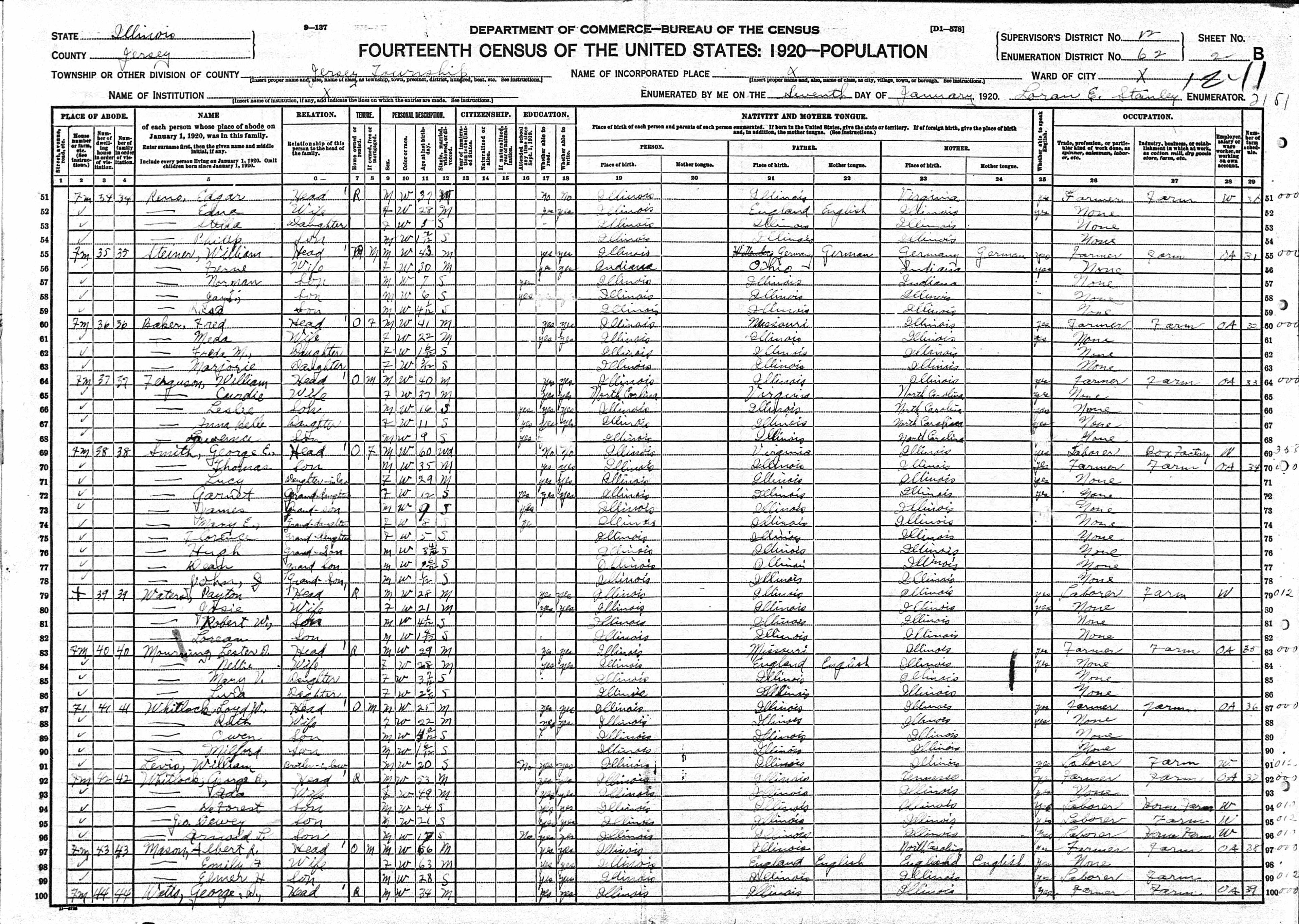 Whitlock Family 1920 Federal Census Illinois, Lines 92-96