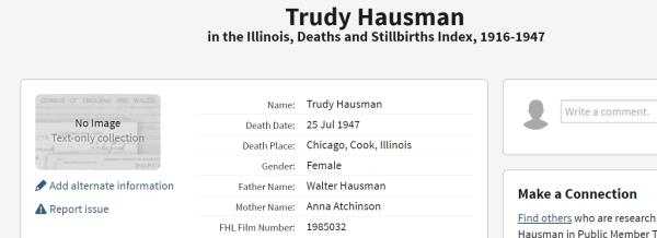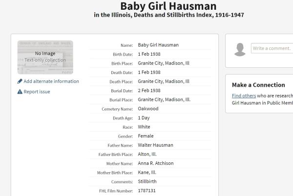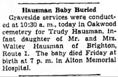 Trudy Hausman was born on July 25, 1947 in Alton, Madison, Illinois, USA. She died on July 25, 1947, at age 0, in Alton, Madison, Illinois, USA. She was buried in Oakwood Cemetery, Alton, Illinois.