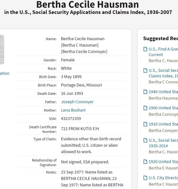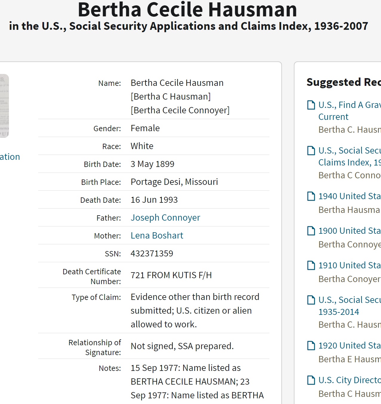 Bertha Cecile Connoyer was born on May 3, 1899 in Portage Des Sioux, St. Charles, Missouri, USA. She and