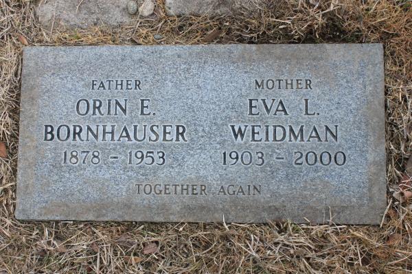 Orin E. Bornhauser were married. She died in 2000, at age ~97, in Modesto, Stanislaus, California, USA. She was buried in Modesto Citizens Cemetery, Modesto, California.