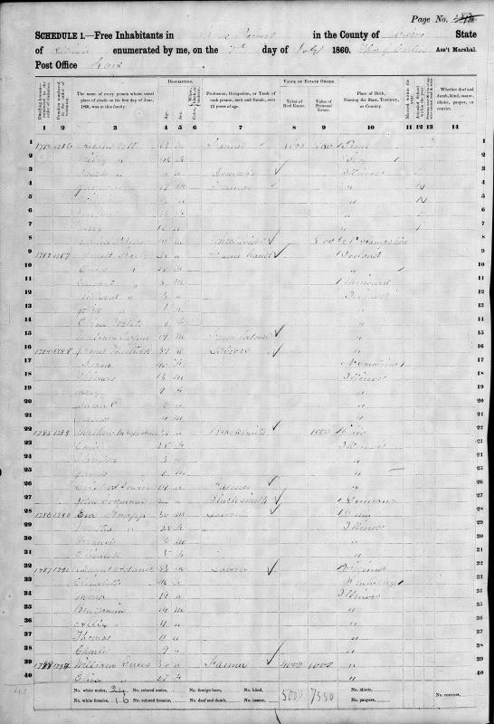 Whitlock Family 1860 Federal Census Illinois, Lines 16-21