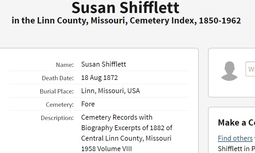 Susan Shifflett were married. He died in 1849, at age ~44.