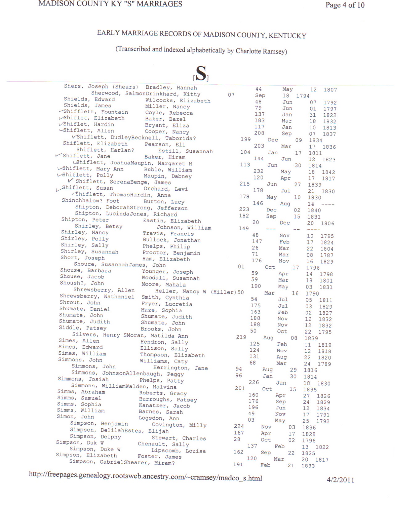 Hardin Shifflett were married on January 10, 1813 in Madison, Kentucky, USA. She died.