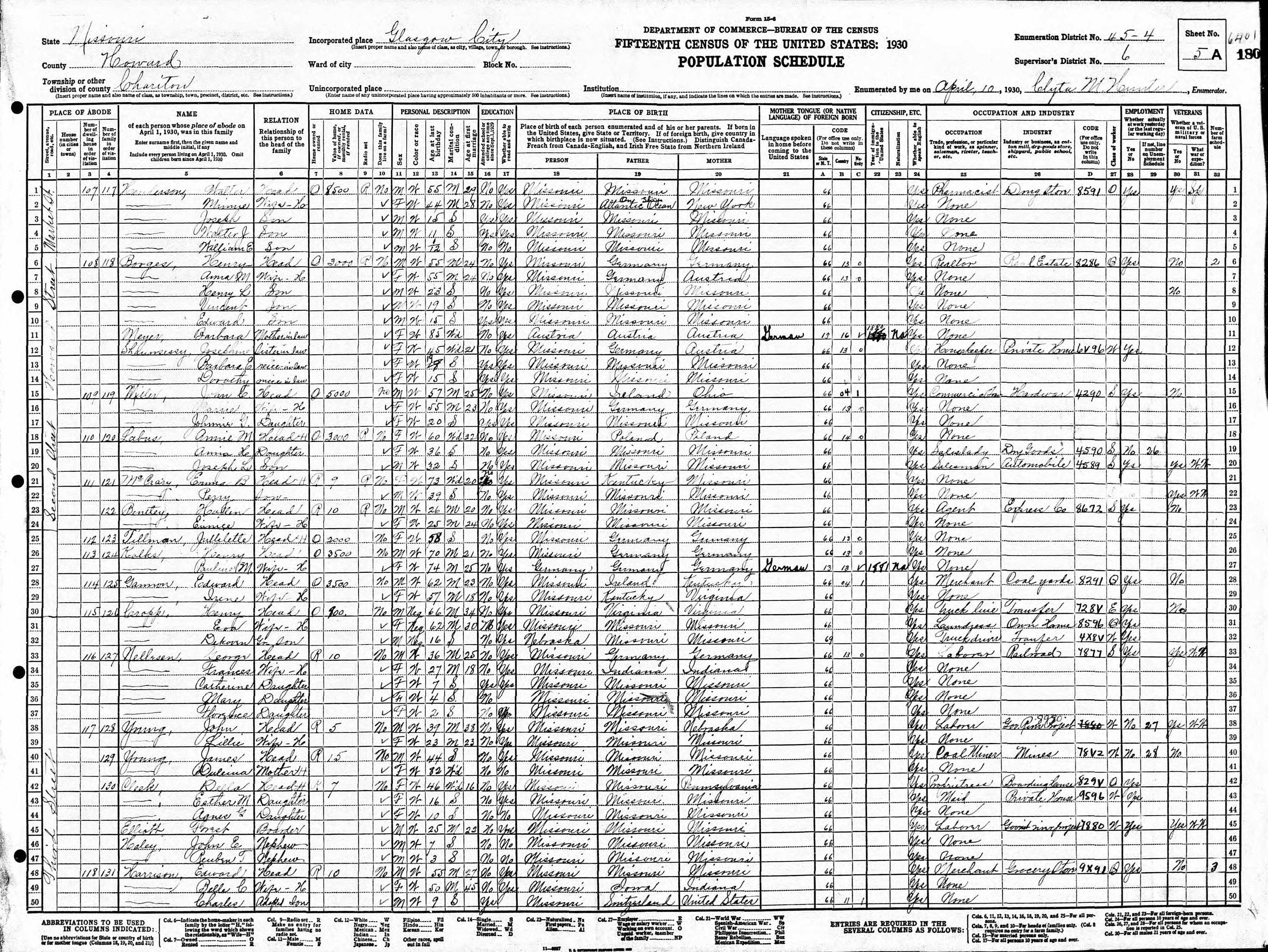 Young Family 1930 Federal Census Missouri, Lines 40-41