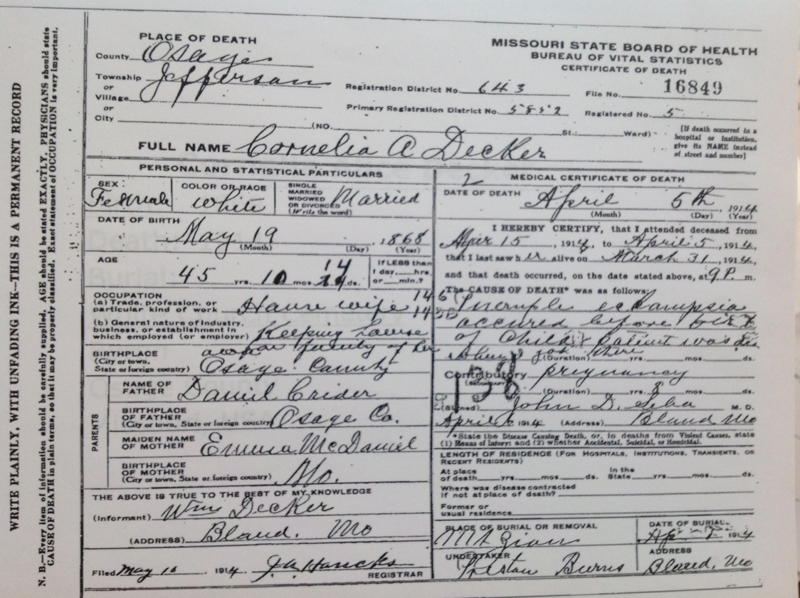 William Decker were married on April 22, 1888 in Osage, Camden, Missouri, USA. She died on April 5, 1914, at age 45, in Jefferson, Osage, Missouri, USA. She was buried in Bland, Gasconade, Missouri, USA.
